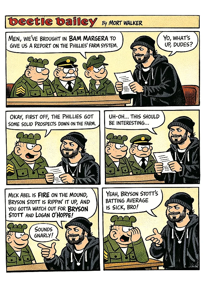 A Beetle Bailey comic strip staring Bam Margera and talking about the Philadelphia Phillies farm system picture 1 of 1