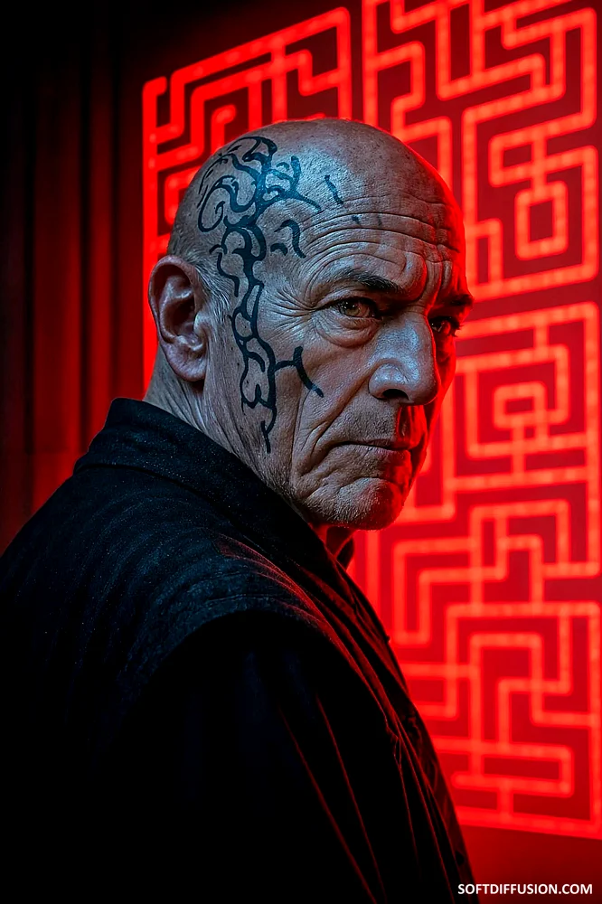 An older, bald man with a distinctive tattoo and a stern, intense expression, looking slightly over his shoulder toward the viewer.