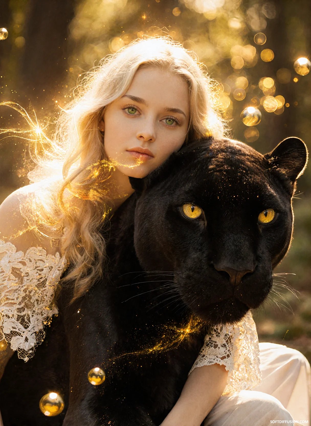 Beautiful and mystical digital artwork that blends fantasy, nature, and ethereal magic. The image portrays an intimate, powerful moment between a young woman and a majestic black panther, bathed in golden, glowing light. picture 1 of 1