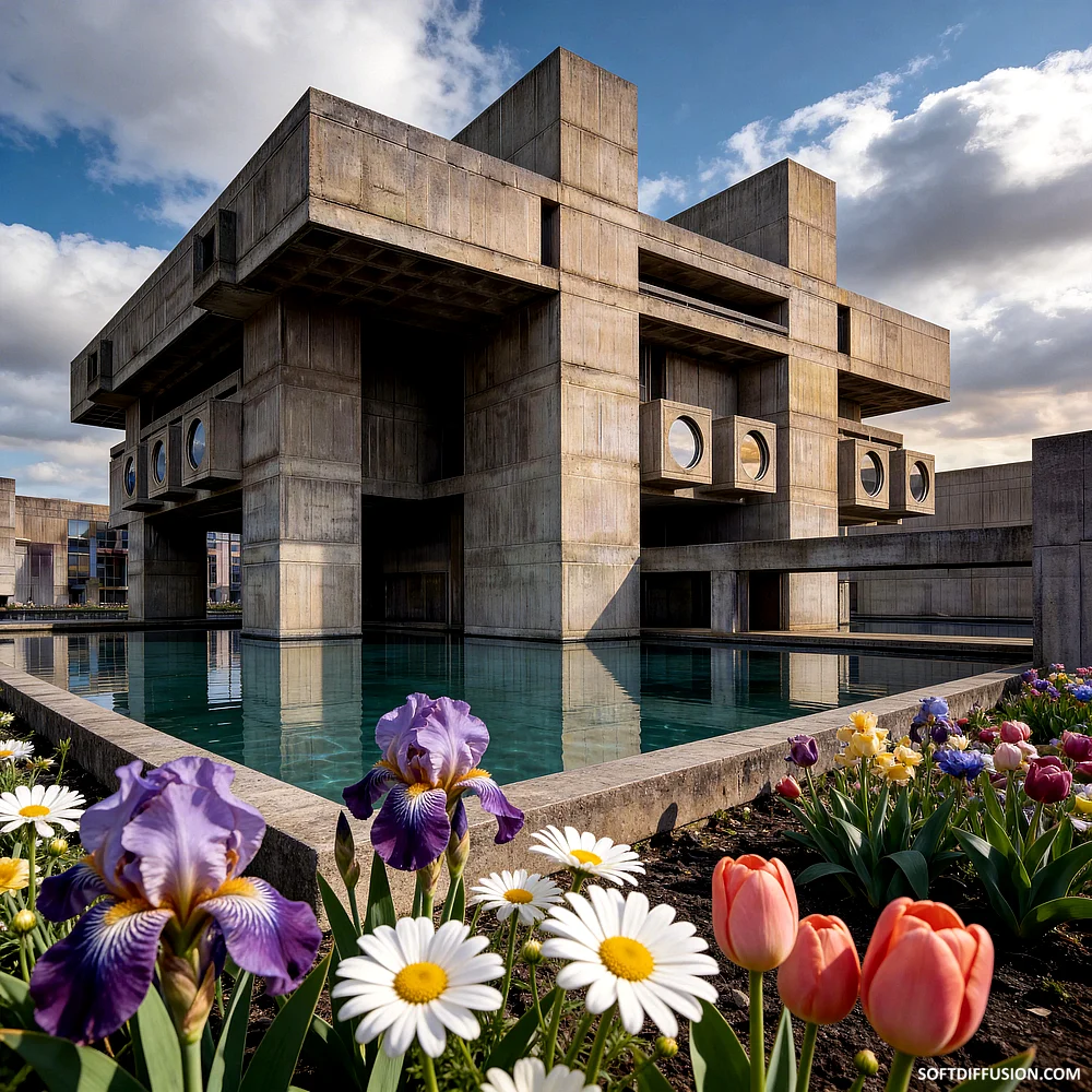 Brutalist architecture and spring flowers