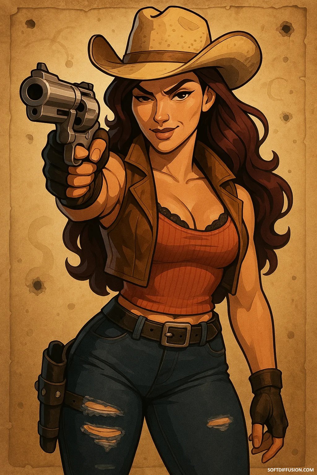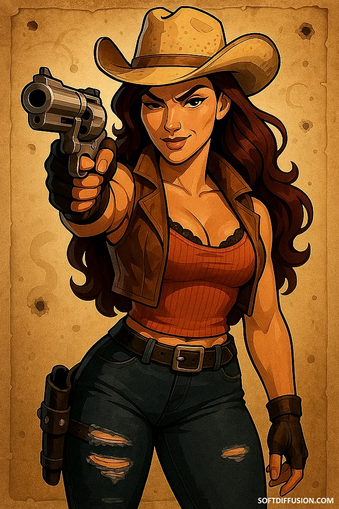 How do I get her eyes looking in the direction of the pistol? No matter what I do, she's always looking at the camera. Also, how do I fix the holster strap clipping into her jeans? picture 1 of 1