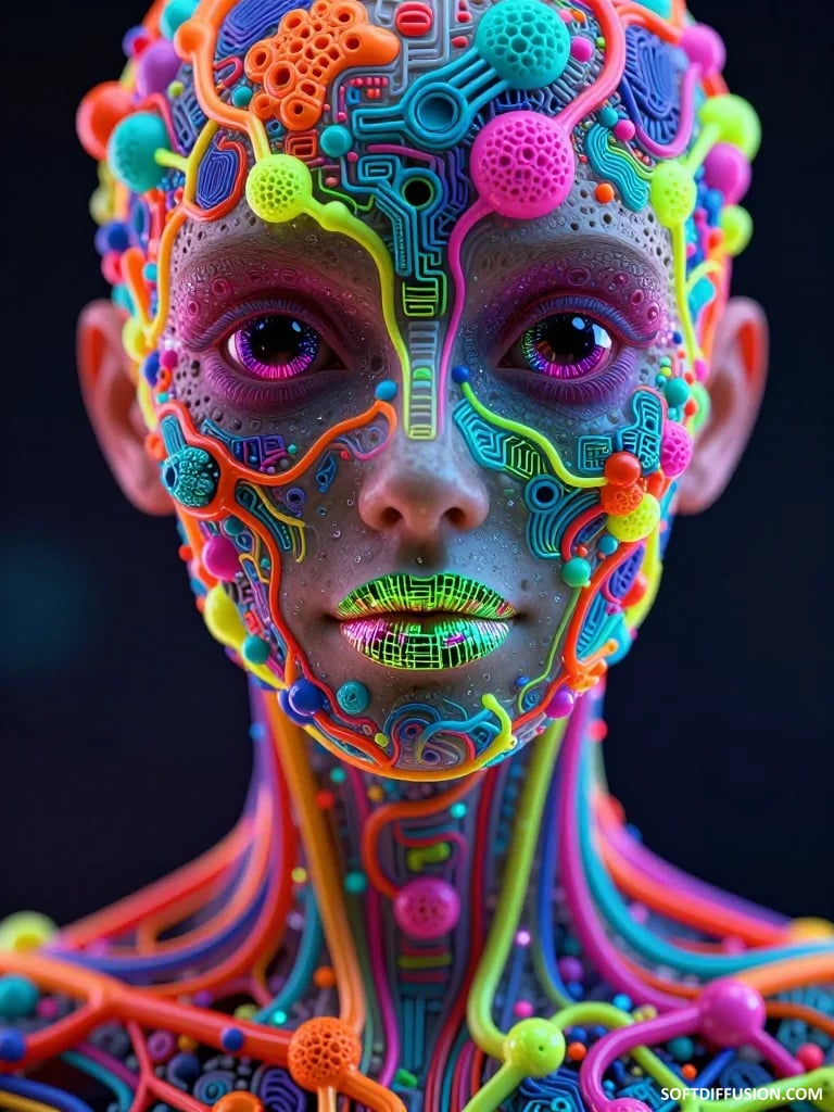 Neon mosaic on gray flesh