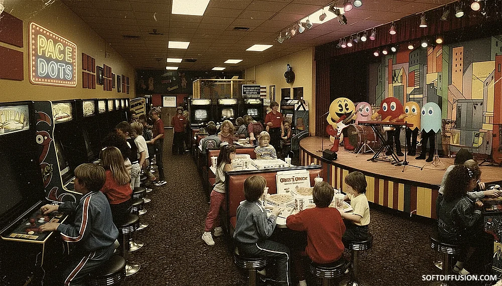"Pac E. Dots" (inspired by "Chuck E. Cheese") 🍕🕹️