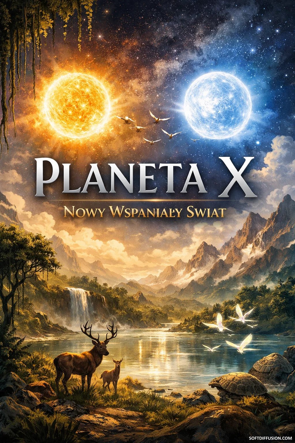The image shows Planet X, which is illuminated by two suns, one yellow-orange and the other blue-white.