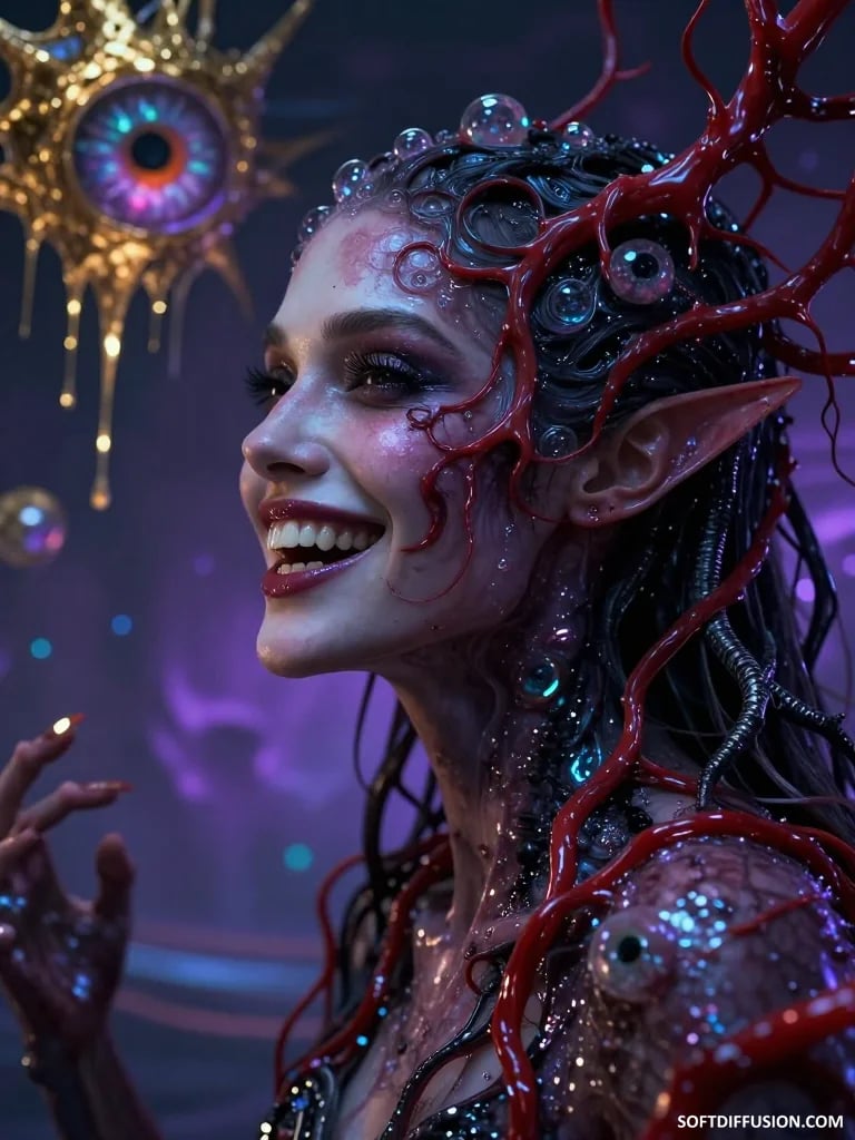 Violet theater of blood‑painted grin