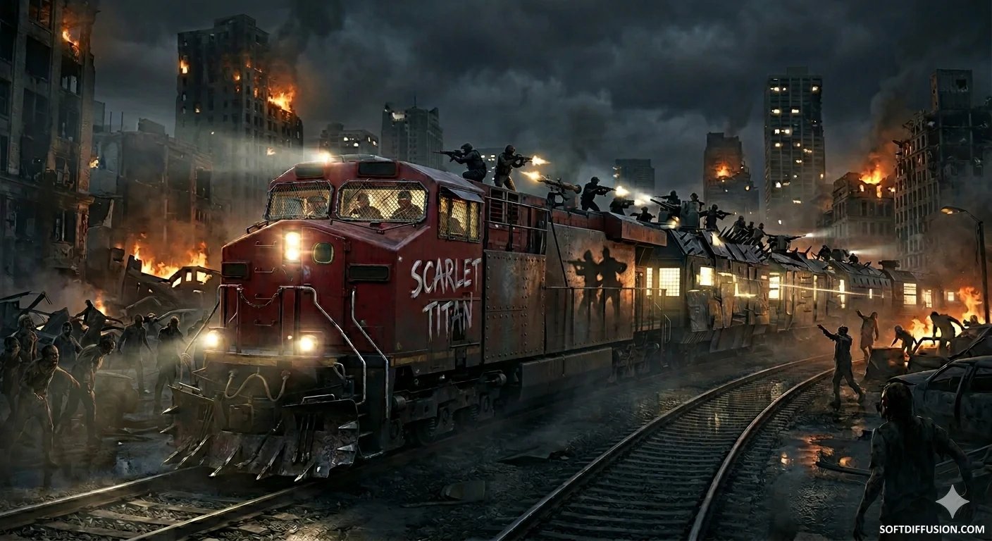 A locomotive passing through a ruined city in a zombie apocalypse.