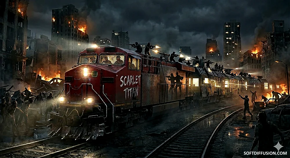 A locomotive passing through a ruined city in a zombie apocalypse. picture 1 of 1