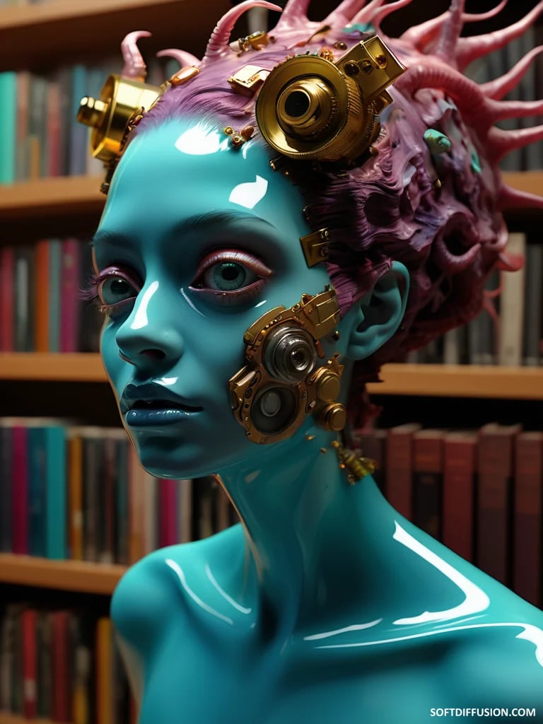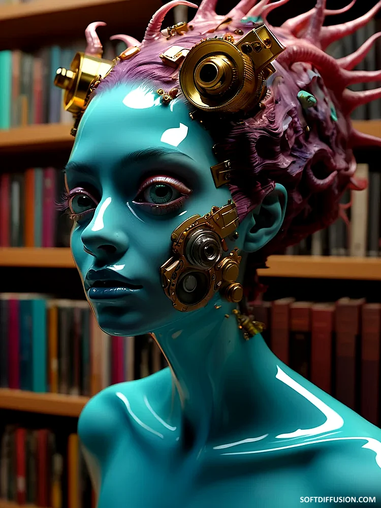 Blue gaze amidst metallic books picture 1 of 1