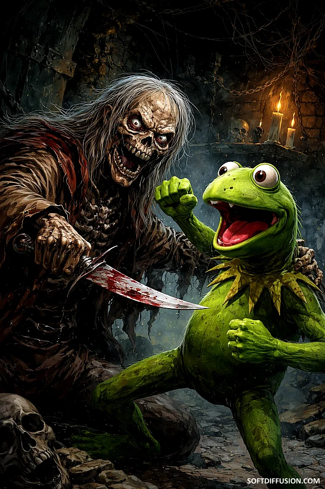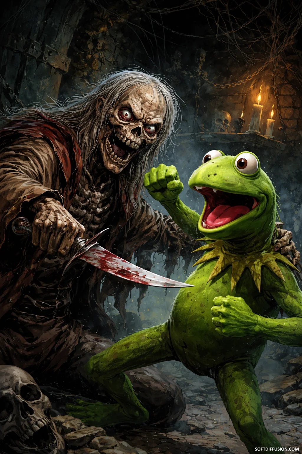 Cryptkeeper fighting Kermit