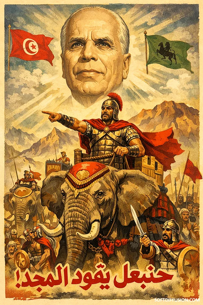 Fake 1960s propaganda poster: Hannibal and Bourghiba lead Tunisia to the glory