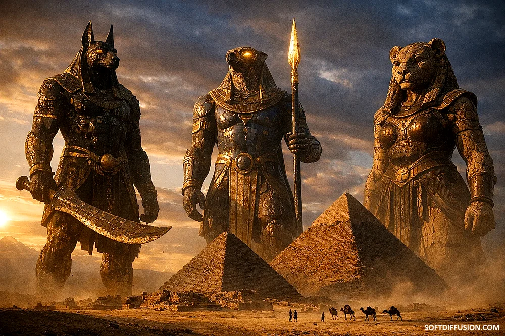 Majestic Egyptian Mythological Colossal Warriors of the Pyramids