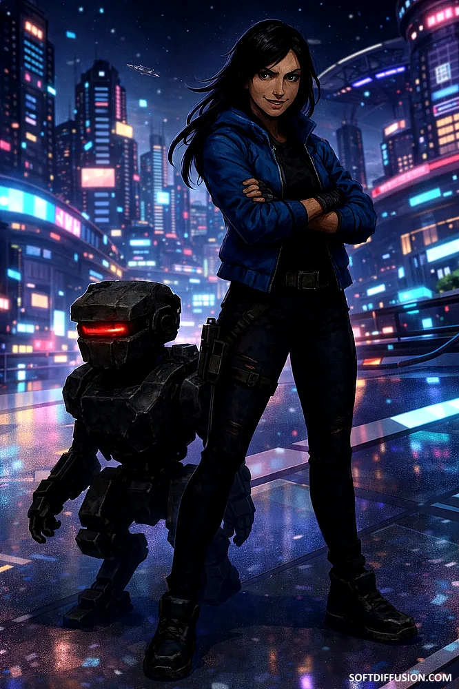 My character in a cyberpunk city.