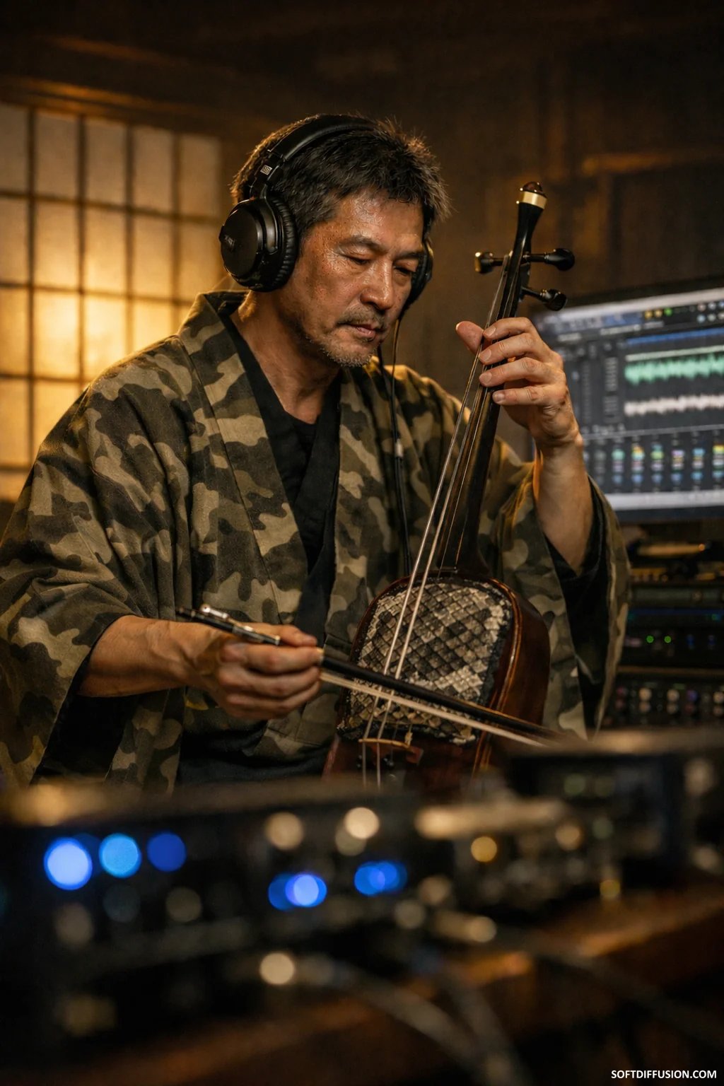 Neo-Japanesque musician recording traditional kokyu in a modern studio (AI-generated)