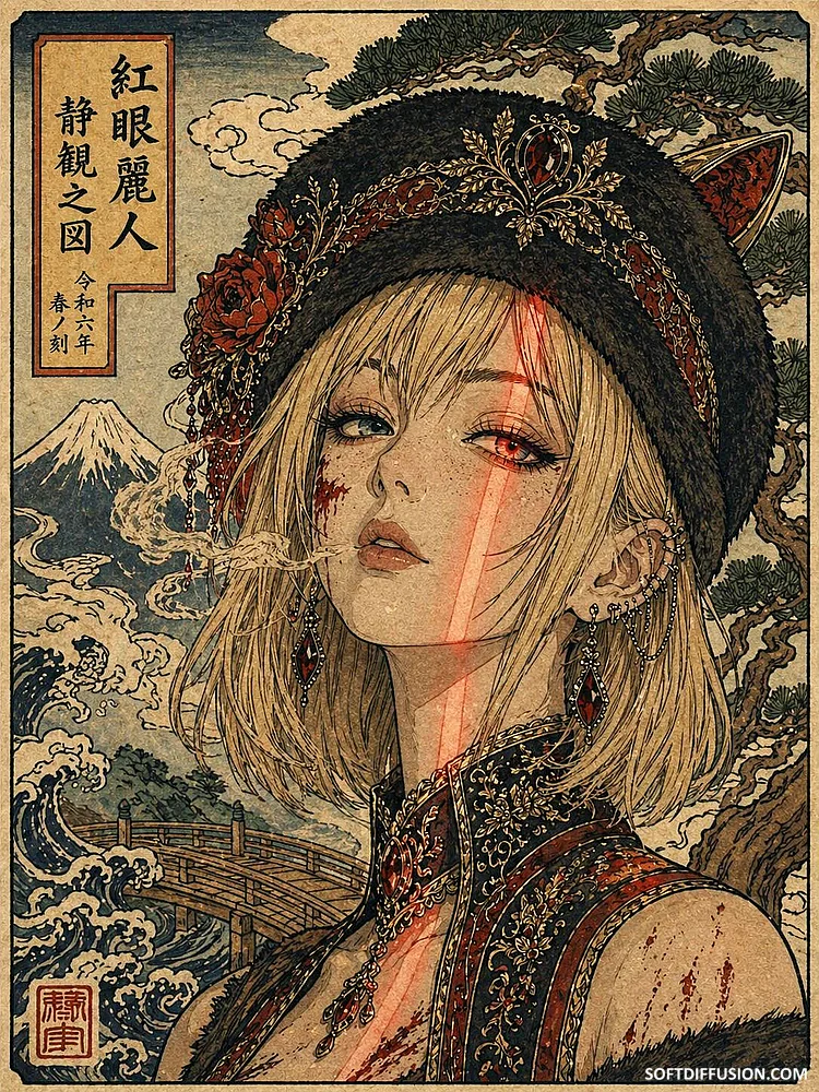 [OC] Red-eyed beauty in a quiet ukiyo-e portrait