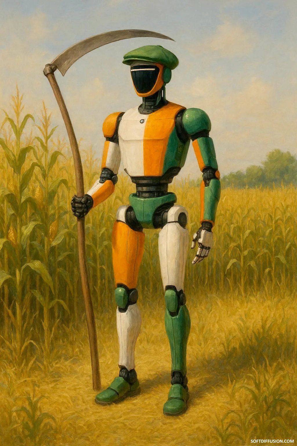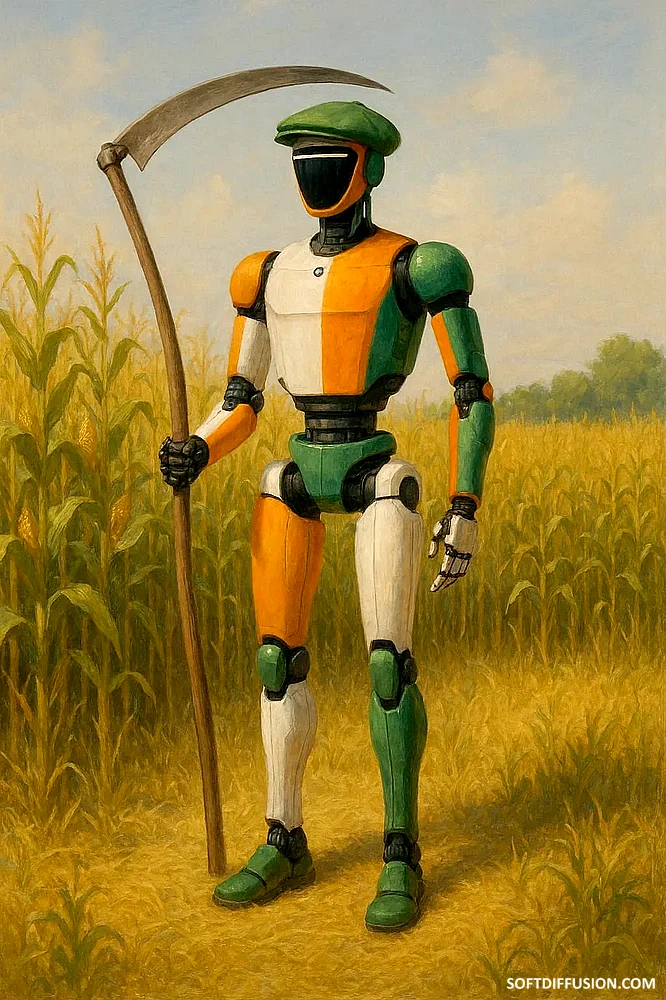 "Off to reap the corn." A real robot (Unitree G1) meets the fictional characters in the movie Sinners, a bit early for St. Patrick's Day. picture 1 of 1
