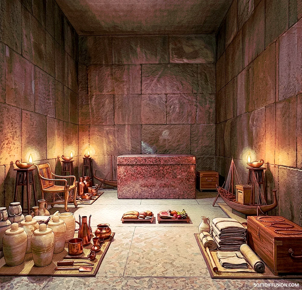 Pharaoh Khufu's burial chamber inside the Great Pyramid after the funeral