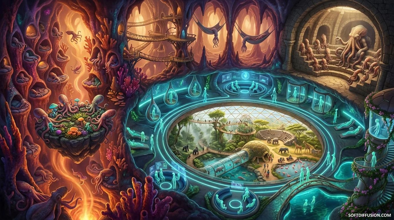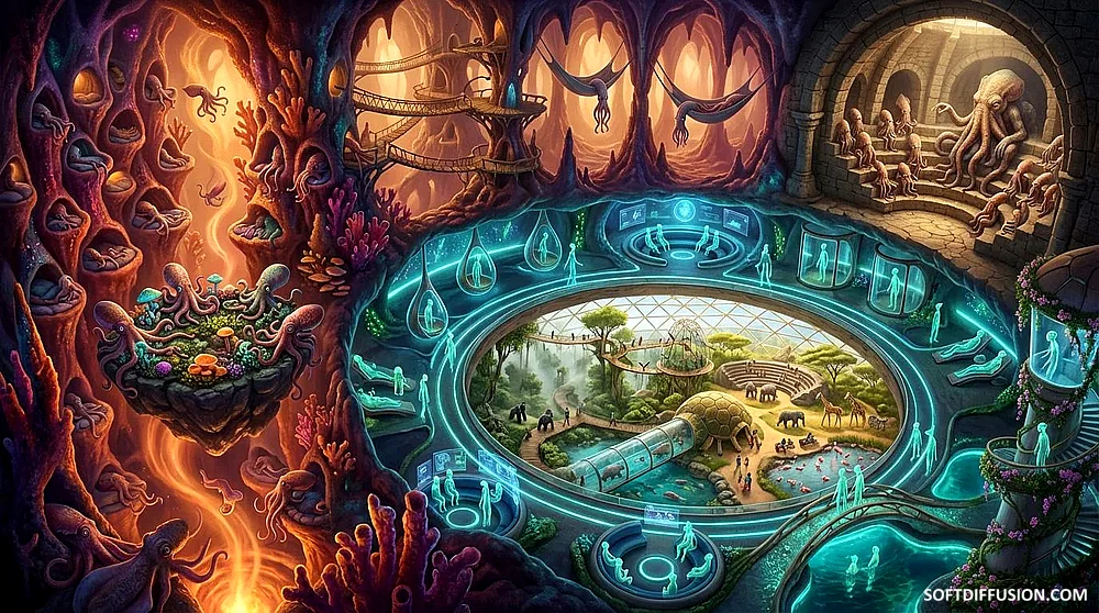 Quad Tier Zoo: Squids watching aliens watching people watching animals
