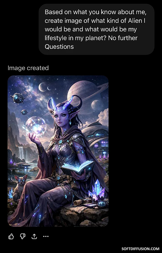 Share what kind of Alien you are by this prompt : “Based on what you know about me, create image of what kind of Alien I would be and what would be my lifestyle in my planet? No further Questions” picture 1 of 1