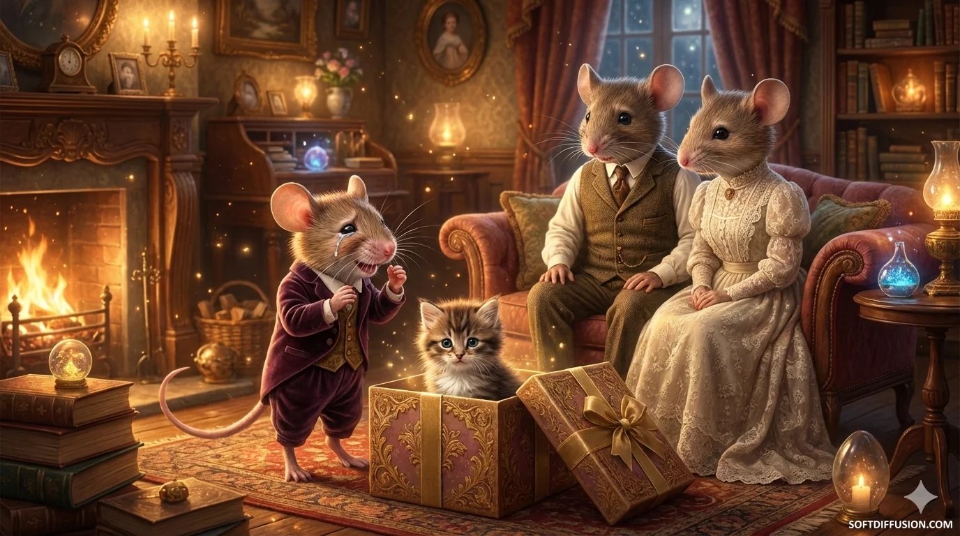 The little mouse was touched by the kitten it received as a gift