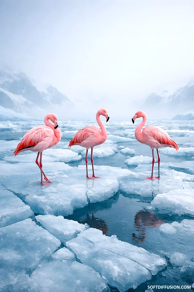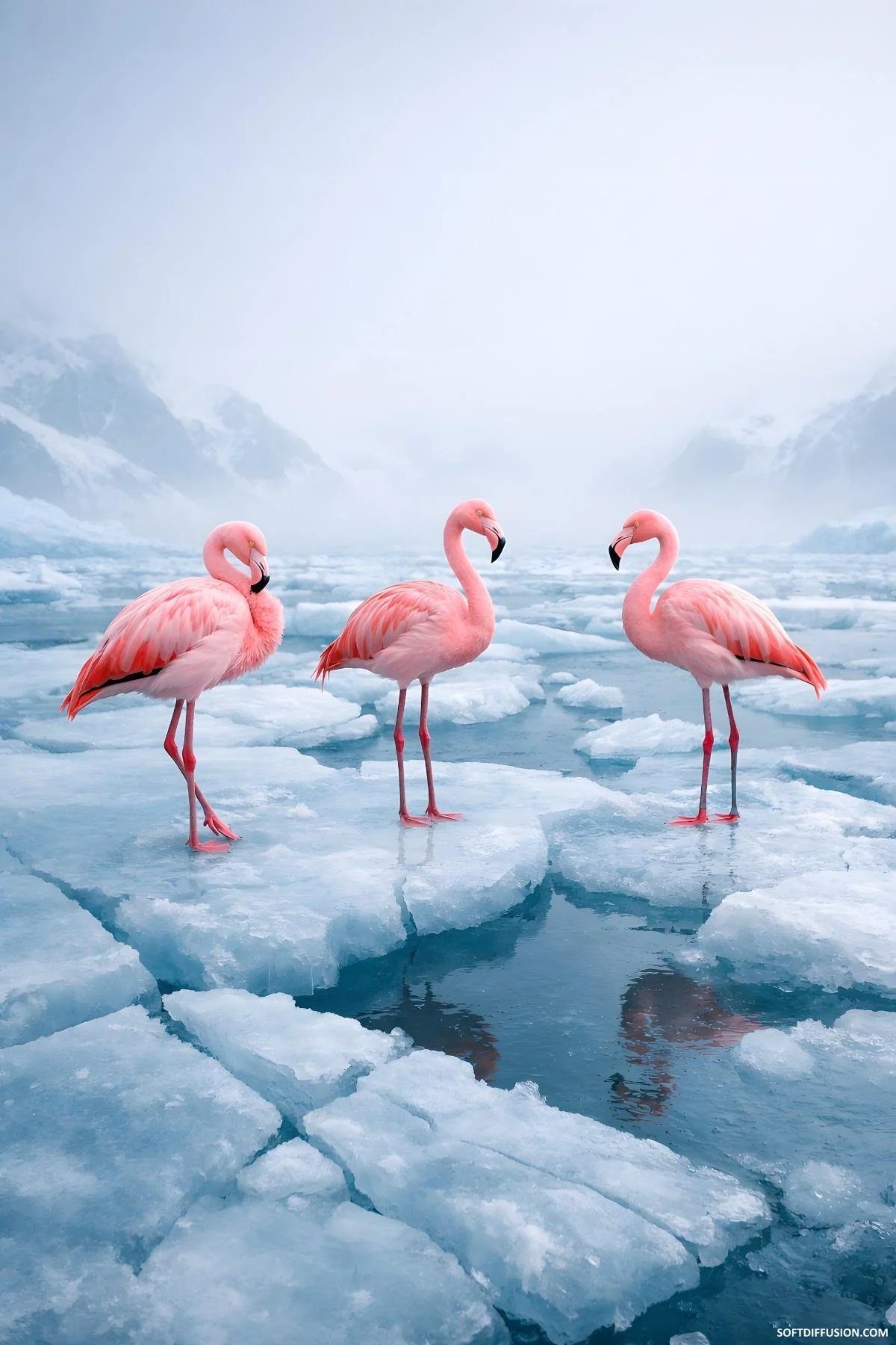 Three flamingos standing on broken ice in the Arctic picture 1 of 1
